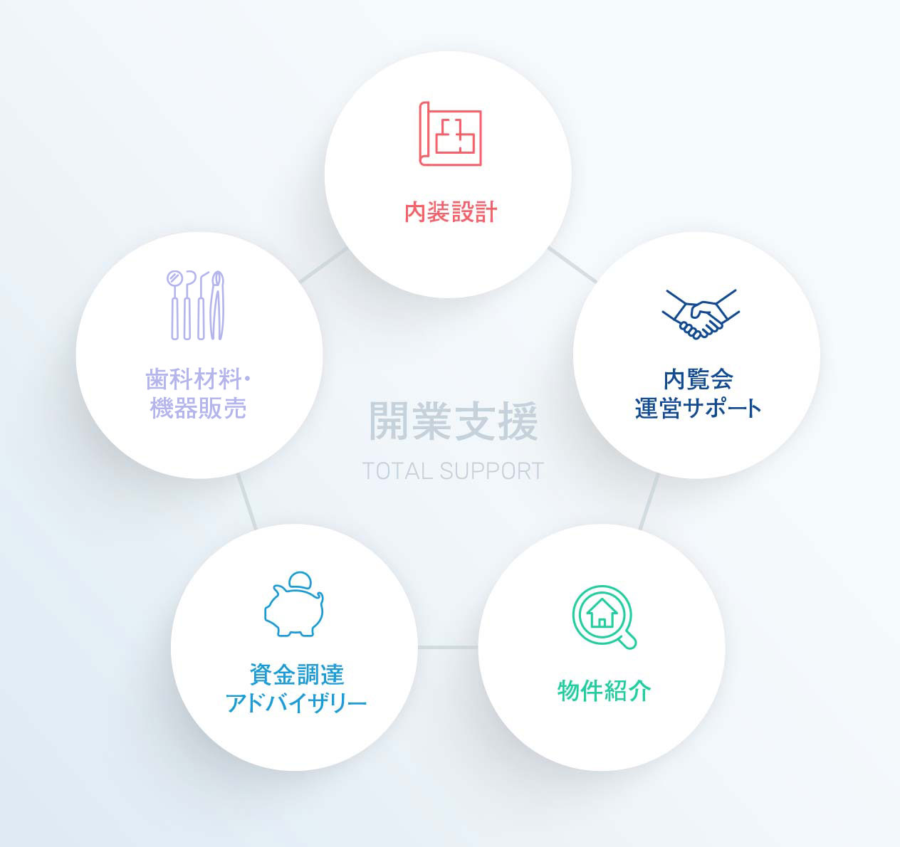 開業にあたっての準備は物件取得から資金調達、医院建設、人材手配など多岐に渡ります。長年、歯科医院を専門に開業をサポートしてきた当社だからこそのノウハウと豊富な情報提供で、開業計画における様々なインフラ整備をお手伝いします。